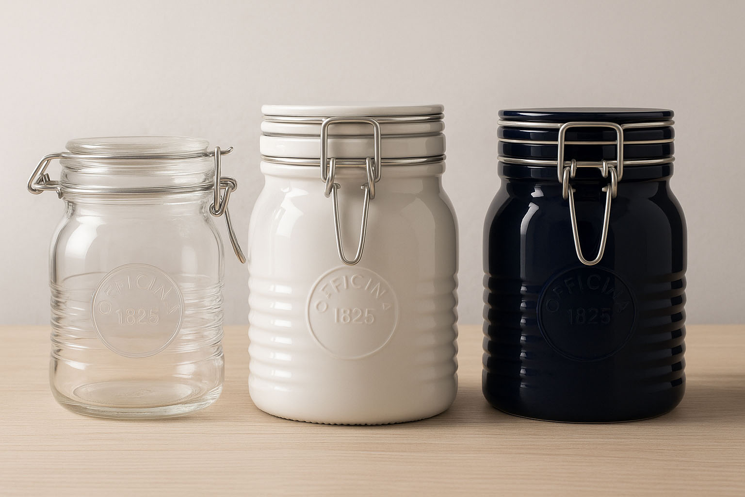 Die Serie „Officina 1825“ des italienischen Herstellers Bormioli Rocco verbindet hochwertige Verarbeitung mit nostalgischem Charme. Das markante Design mit Rillen an der Glasführung und dem eingestanzten „1825“-Logo macht jedes Glas zu einem echten Blickfang. Diese stilvollen Drahtbügelgläser wurden speziell für Feinkostproduzenten, Hotels und anspruchsvolle Privatabfüller entwickelt, die Wert auf Ästhetik und Qualität legen. Erhältlich in den Farben Blau, Rot und Weiß als Teil der Sonderserie Color, bietet „Officina 1825“ eine exklusive Möglichkeit, feine Spezialitäten geschmackvoll und sicher aufzubewahren.